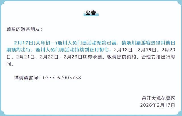 2月17日(大年初一)浙川人免门票活动预约已满。请淅川籍游客选择其他日期预约出行,淅川人免门票活动持续到正月初七,2月18日、2月19日、2月20日、2月21日、2月22日、2月23日还有余票。