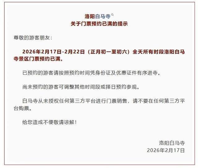 2026年2月17日-2月22日(正月初一至初六)全天所有时段洛阳白马寺景区门票预约已满。已预约的游客请按照预约时间凭身份证及优惠证件有序进寺。尚未预约的游客可调整其他时间段或择日预约参观。