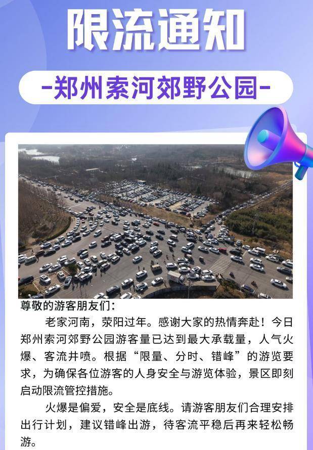 2月17日,郑州索河郊野公园游客量已达到最大承载量,人气火爆、客流井喷。根据“限量、分时、错峰”的游览要求,为确保各位游客的人身安全与游览体验,景区即刻启动限流管控措施。
