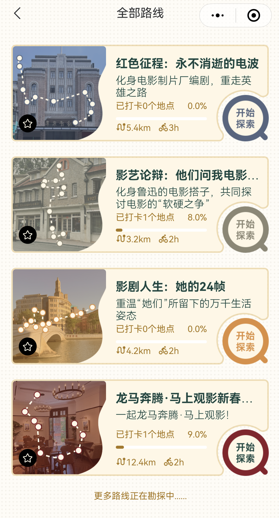 游客进入小程序后,在每一个地标点,不仅能了解建筑历史,还能看到在此取景的电影故事,可以用定制透卡打卡,生成“同款剧照”。各地标点位之间,也串联起观影、书店、咖啡、餐饮等场景。